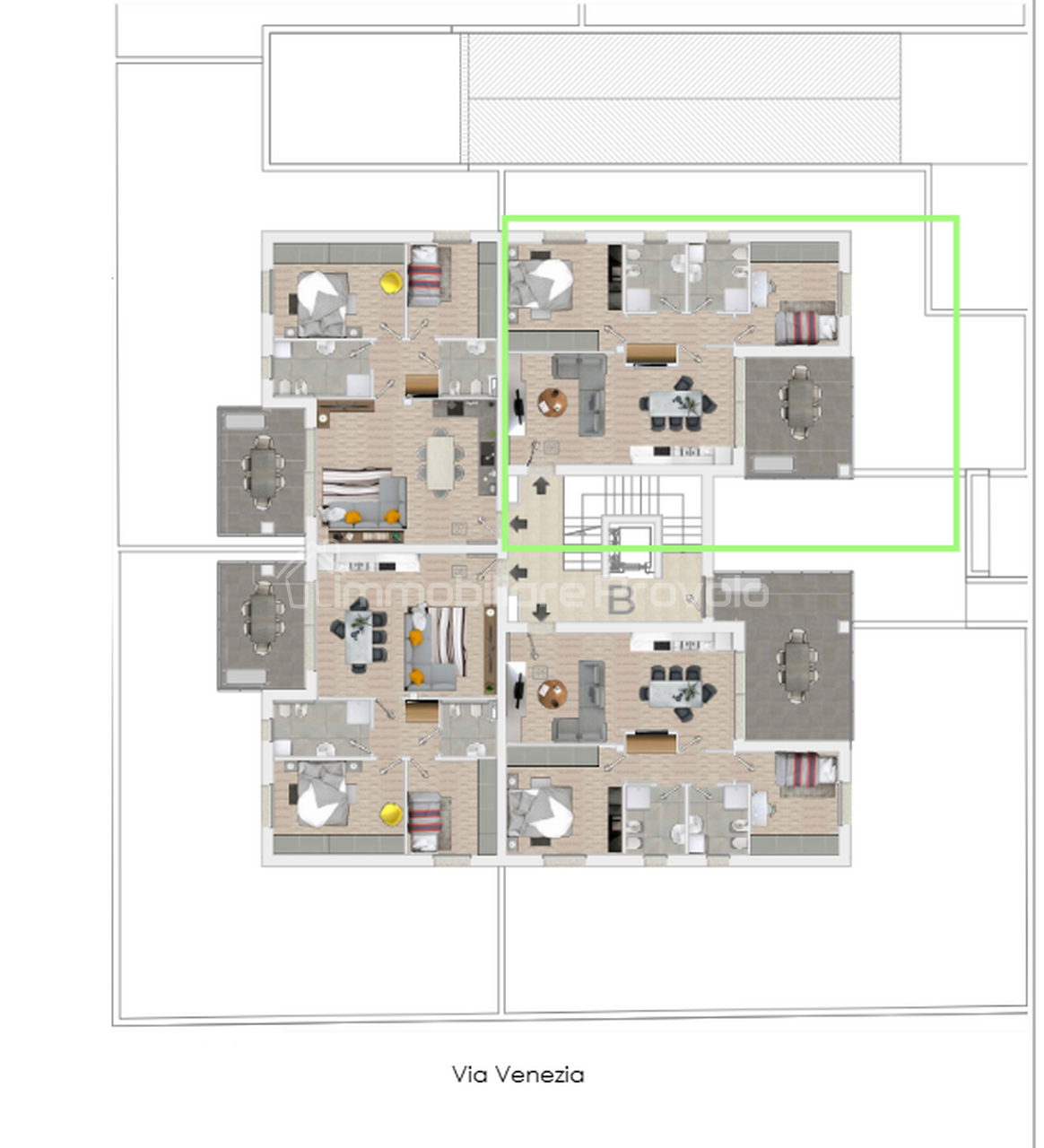 Proponiamo appartamento (B8) al primo piano servito da ascensore. L' immobile presenta soggiorno con angolo cottura, camera matrimoniale, camera doppia e due bagni finestrati, ampio terrazzo e garage doppio in lunghezza di 30 mq. Attestato di prestazione energetica in Classe A4. Possibilità di scelta delle finiture.
